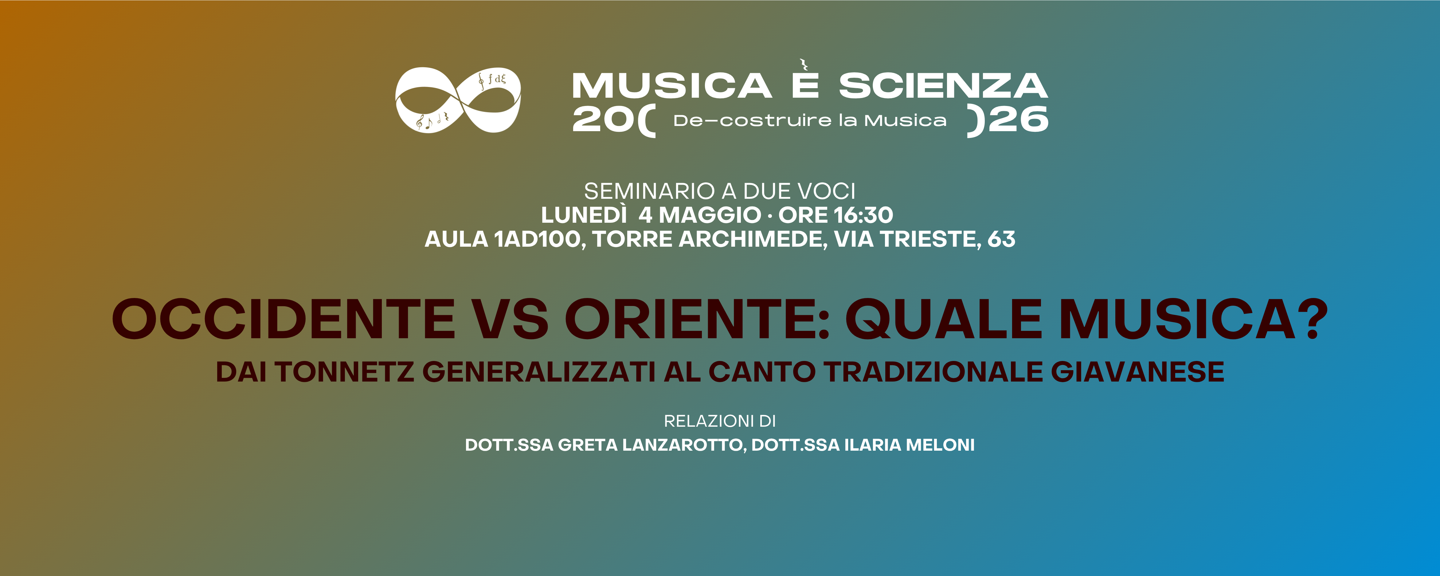 Il seminario a due voci confronta due modelli musicali culturalmente opposti: da una parte un modello matematico di analisi della musica “occidentale” e costruzione di canoni con un’applicazione al canto pop e jazz; dall’altra un sistema musicale “orientale” con i suoi particolari strumenti e le sue differenti scale, il Gamelan indonesiano, con focus sul canto giavanese.